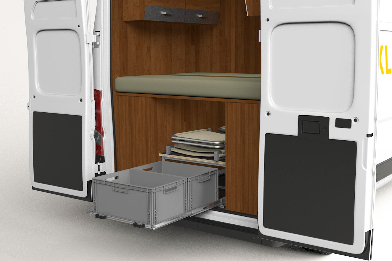 Notre tiroir arrière pour camping-cars et fourgons – qu'il soit simple, avec étagère, à plusieurs niveaux ou en kit d'aménagement – est parfaitement adapté aux Eurobox. Vous pouvez le recevoir prêt à être expédié ou avec installation directement dans notre atelier à Bensheim.